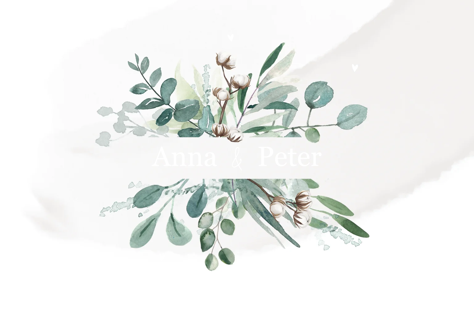 Rechteckige weiße Save the date Karte im Modern Eucalyptus Stil mit Blumen und Herzen in Aquarell-Effekt.Sieh dir auch die dazugehörige Hochzeitskarte, Menükarte und Dankeskarte an.