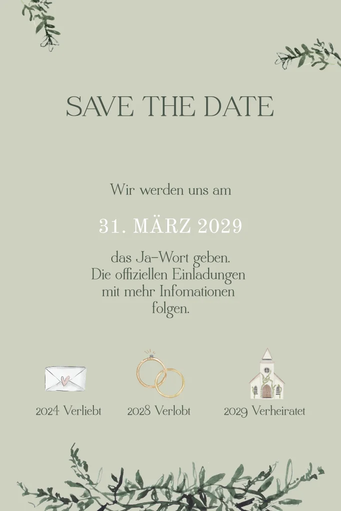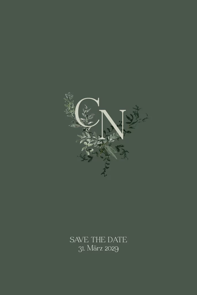 Stilvolle Save the Date Karte mit Initialien und ZweigenDas Design der von dir gewählten Karte wurde automatisch in andere Formate umgestellt. Wähle einfach deinen Wunschformat aus und platziere alle Texte und Elemente an der richtigen Stelle im Editor. Du hast Fragen oder dein Favorit steht nicht zur Auswahl? Dann kontaktiere uns bitte und wir werden uns gemeinsam darum kümmern!