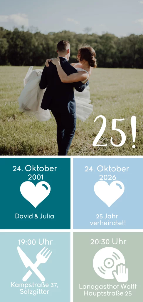 Einladung zur Silberhochzeit mit witizigen Icons für die Informationen