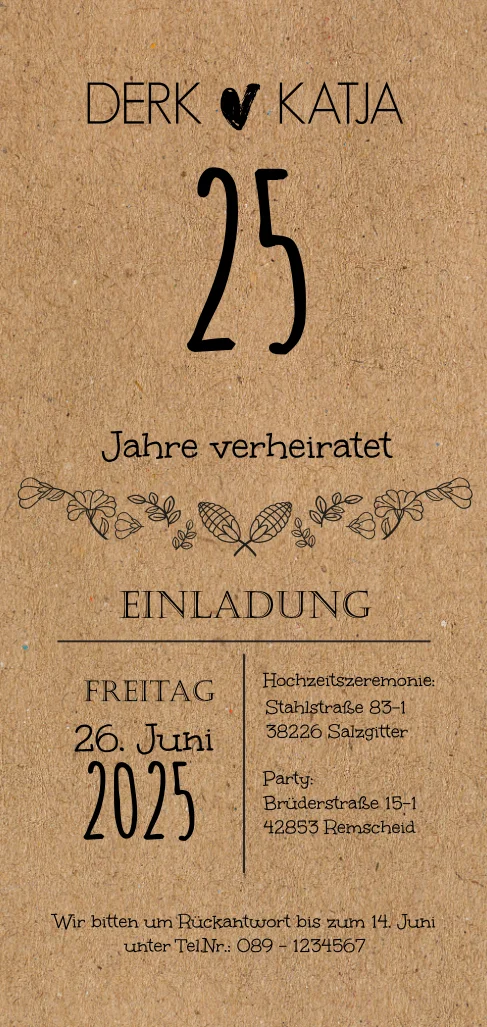 Einladung zur Silberhochzeit mit Herzen und Kraftpapier-Look