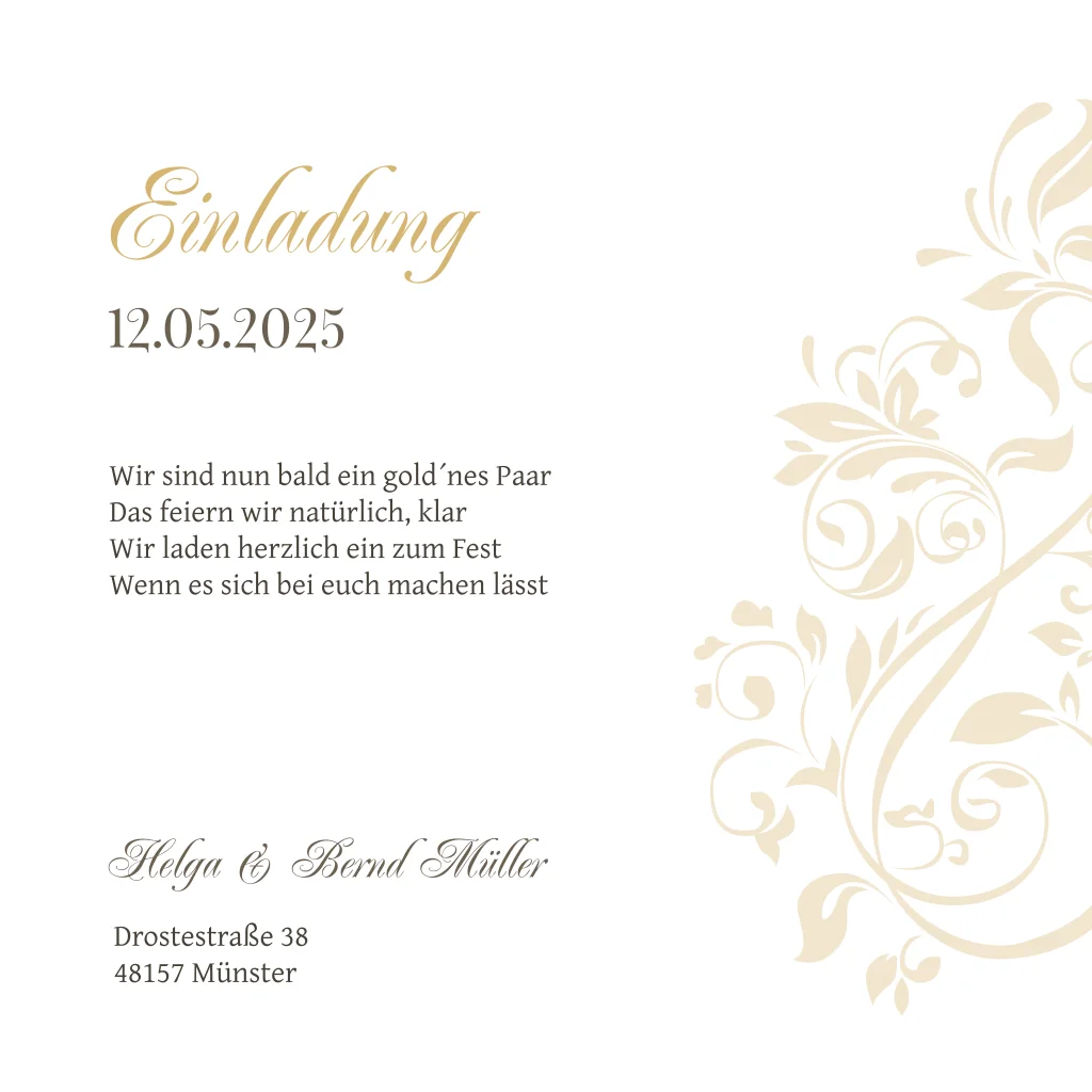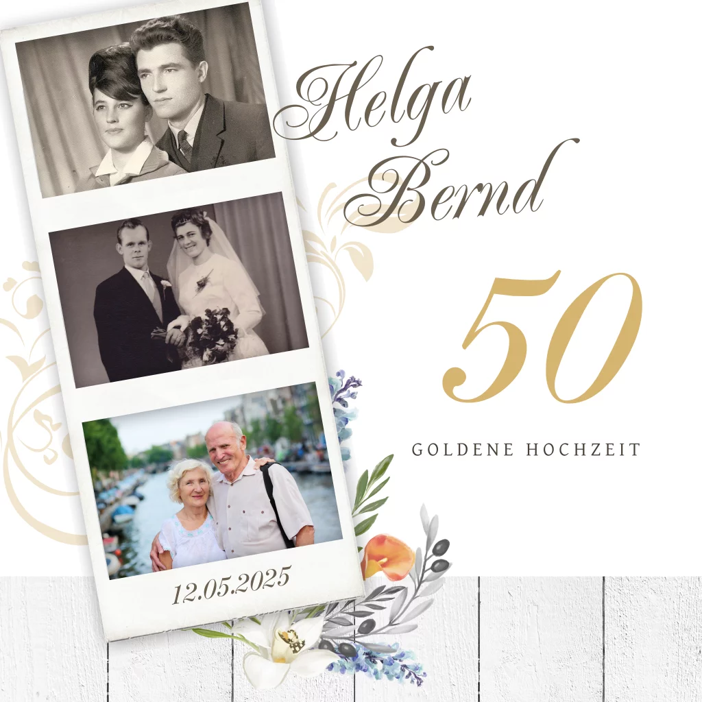 Goldene Hochzeit Einladung mit Fotostreifen und Blumenstrauß