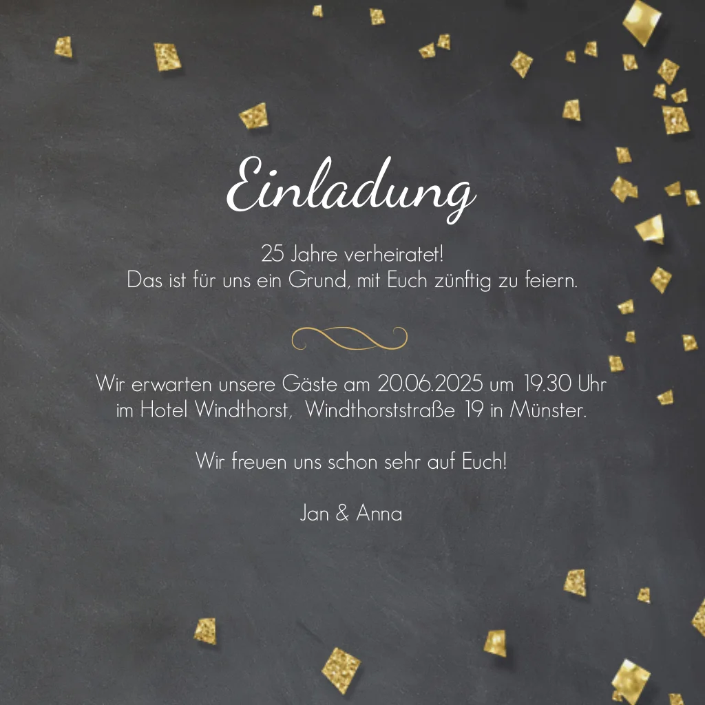 Diese Jubiläumskarte für Ihre Silberhochzeit hat einen coolen und festlichen Look. Auf dem Hintergrund im Kreidetafel-Look befindet sich ein Herz und goldenes Konfetti. Sie können ein Foto von Ihnen in den herzförmigen Rahmen einfügen.