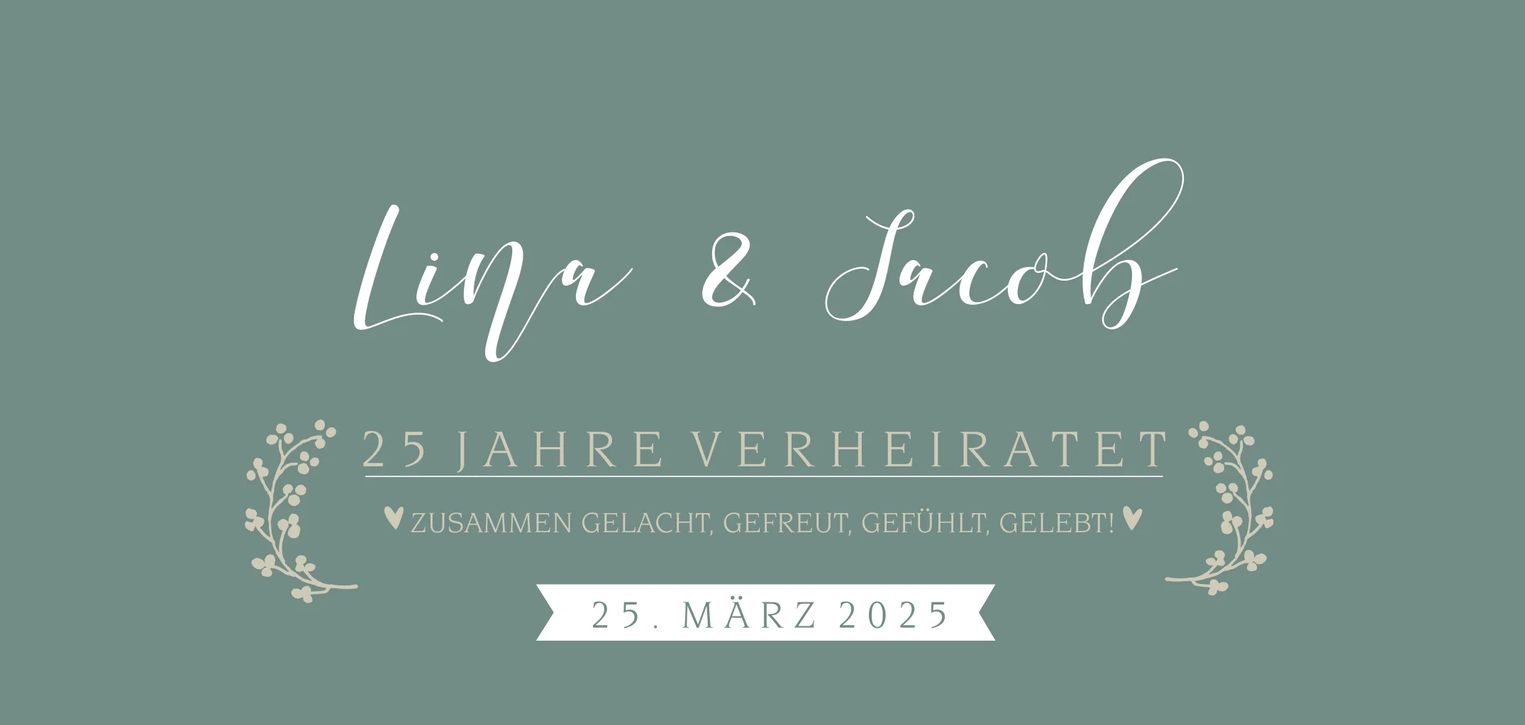Eine schicke und romantische Panoramakarte zum Jahrestag. Das Design der Karte besteht aus einem eleganten Schriftstil und eleganten Zweigen. Du kannst die Farbe und den Text auf der Karte in unserem Online-Editor individuell gestalten.