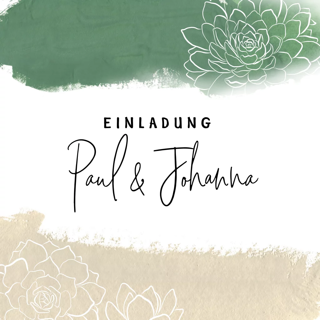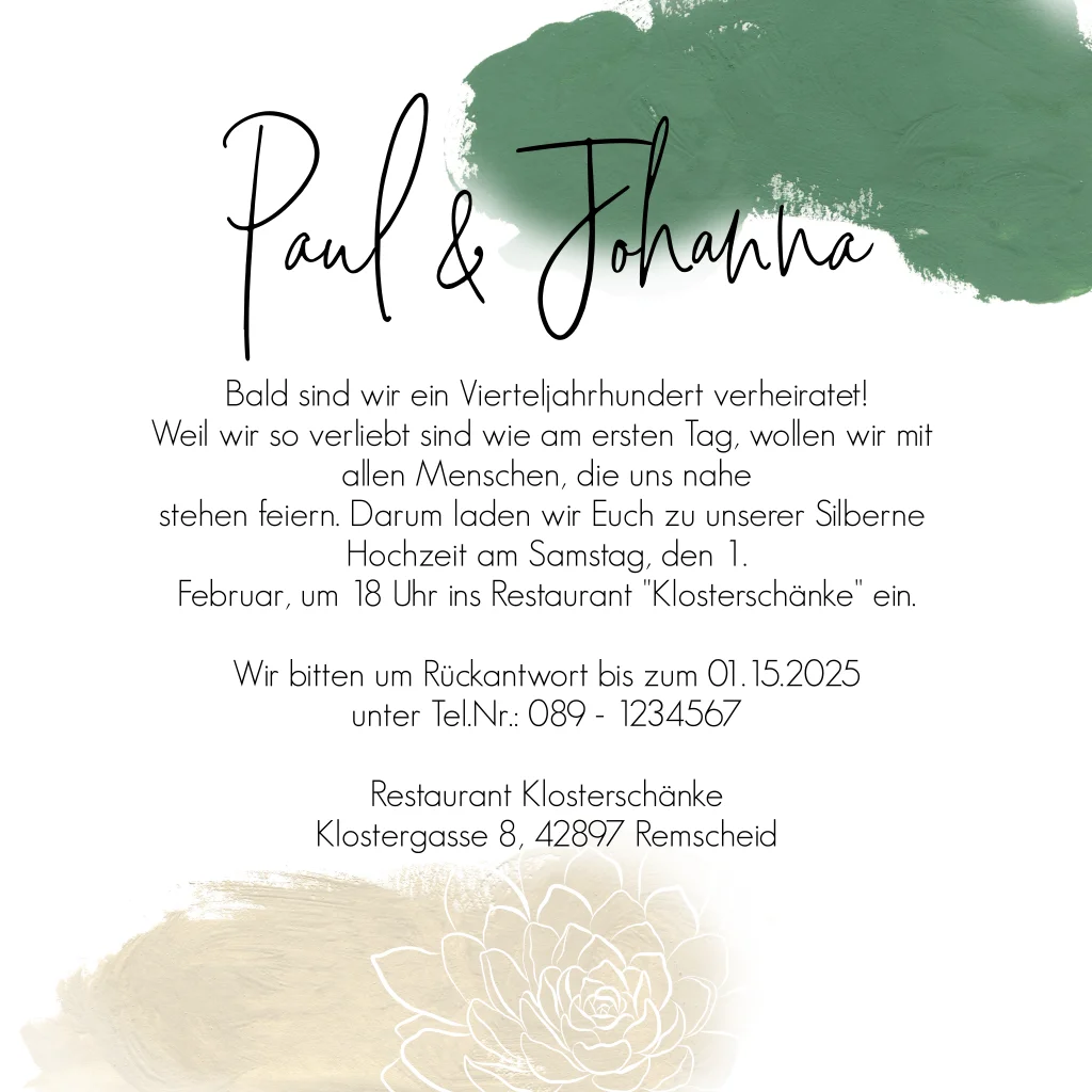 Eine quadratische Einladung zur Silberhochzeit, die durch die Kombination der Aquarellflächen mit Blumenblüten besticht. Den Einladungstext an Ihre Gäste können Sie einfach in unserem Online-Editor individuell anpassen.