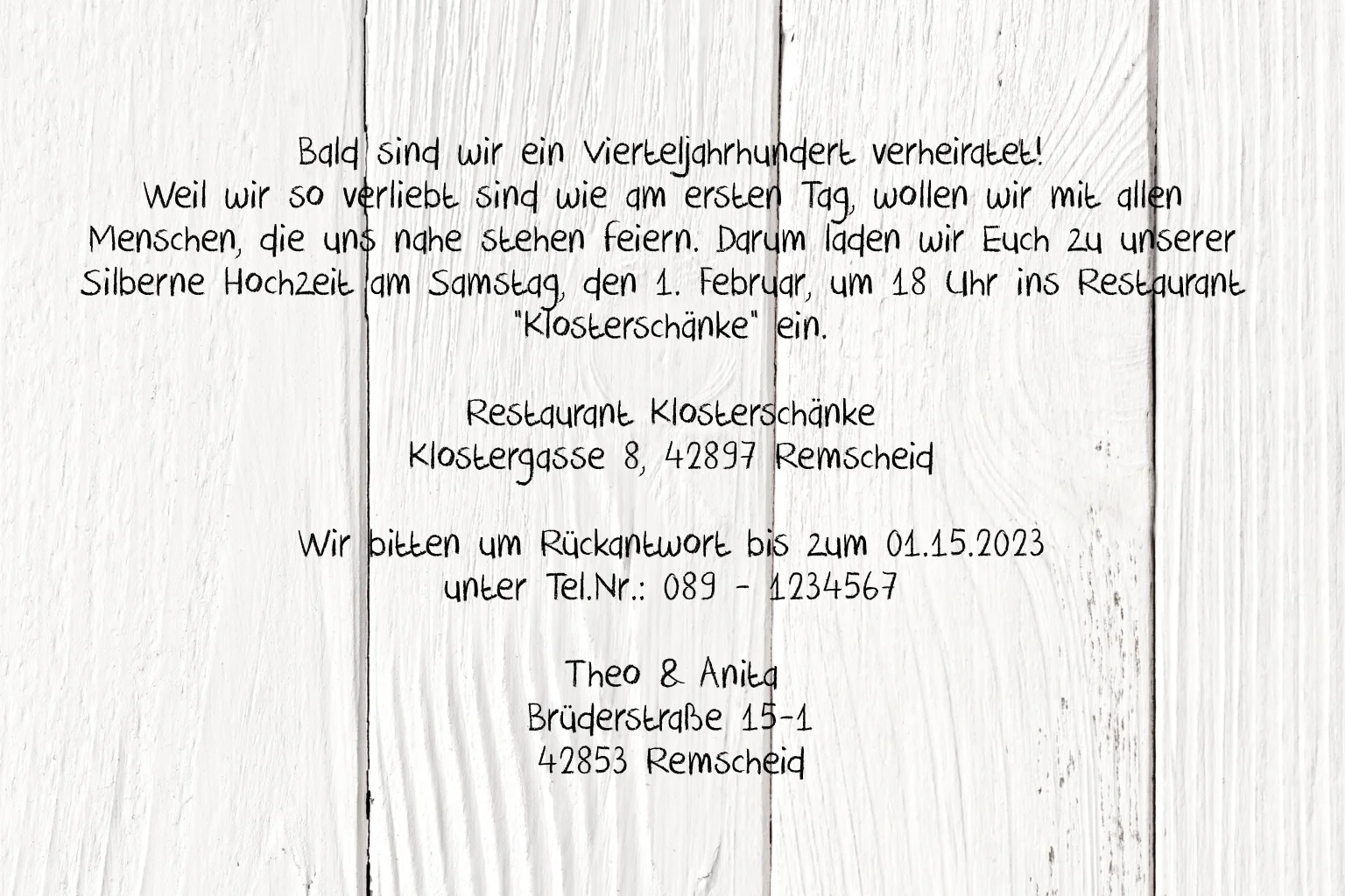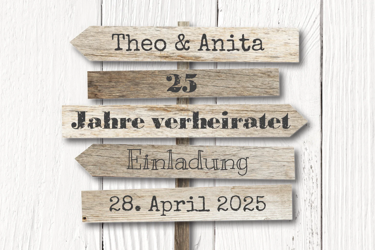 Coole Silberhochzeitseinladung mit Wegweiser und Holzhintergrund