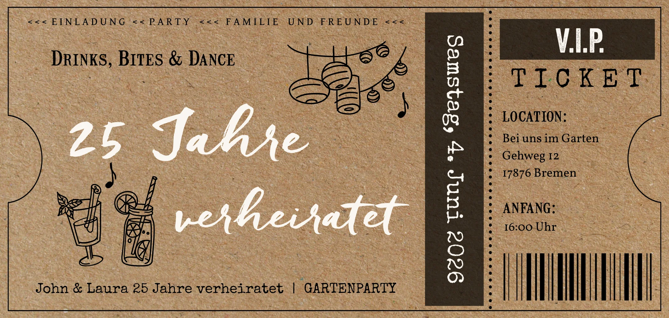 Einladung Silberhochzeit Gartenparty in VIP Ticketform im Kraftlook