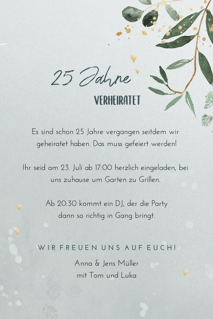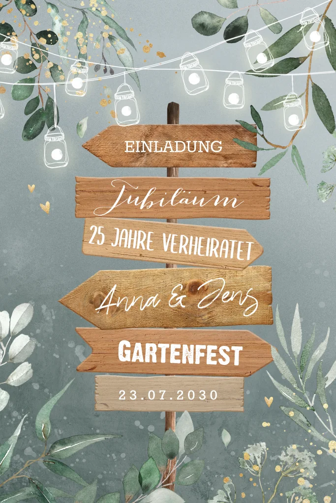 Einladung zur silbernen Hochzeit mit Lichterkette und Wegweiser