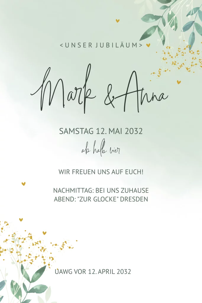 Einladung zur Jubiläumsfeier mit Zweigen und goldenen Sprenkeln