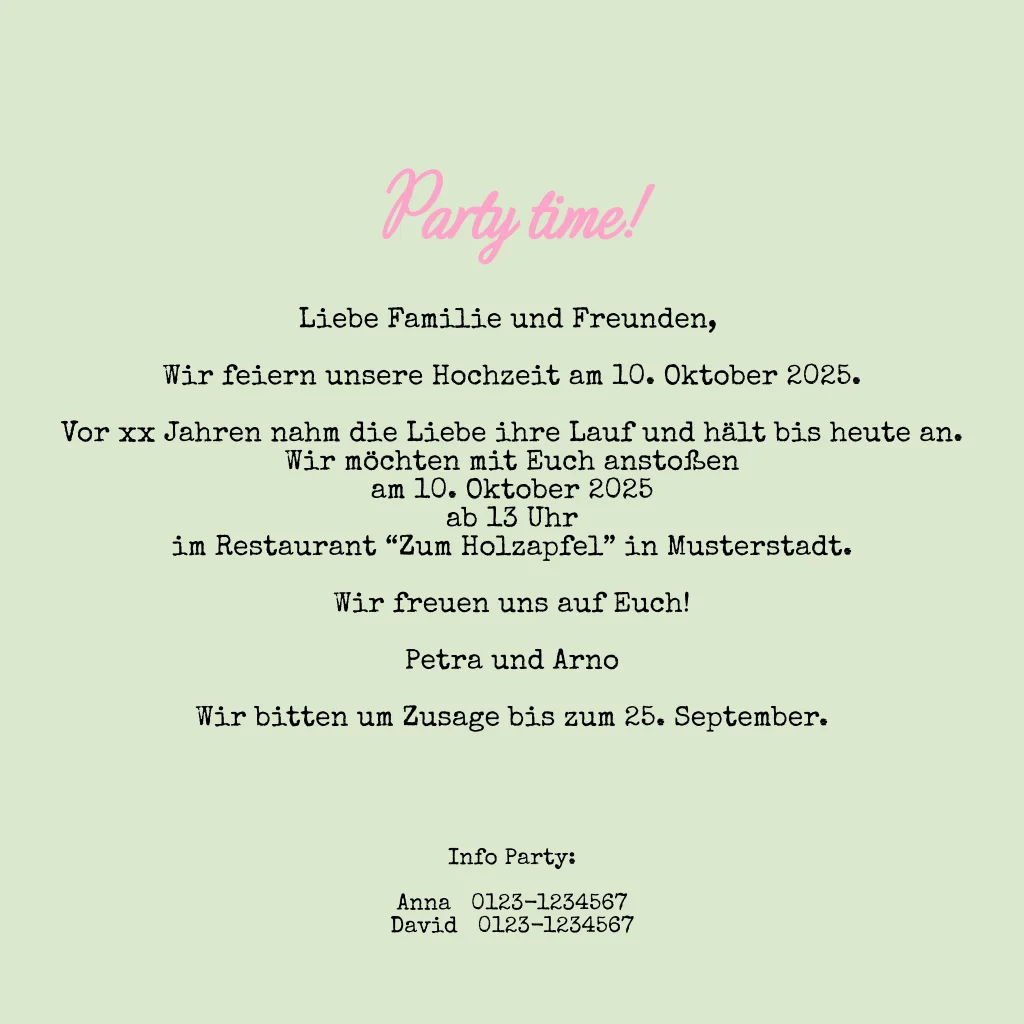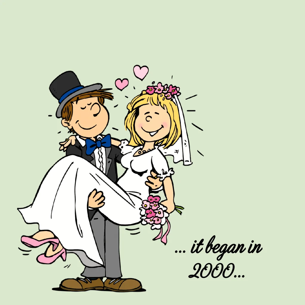 "... es fing an in 2000 ...und 2025 sind wir immer noch glücklich verheiratet!" Das Comic-Ehepaar auf dieser quadratischen Einladungskarte stimmt sofort fröhlich! Sie können die grüne Hintergrundfarbe nach Geschmack ändern. Wann werdet Ihr feiern?