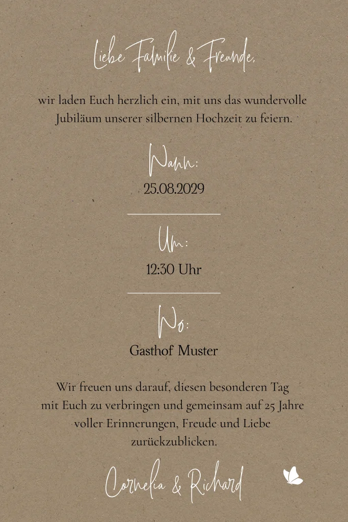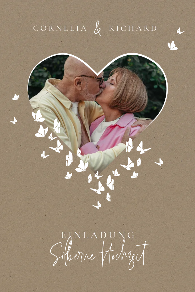 Klappkarte zur Silbernen Hochzeit mit Foto, silbernen Herzen und Schmetterlingen auf Kraftpapier.