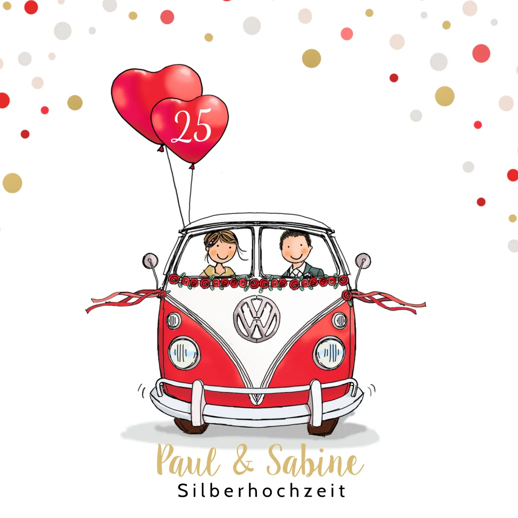 Trendy Einladungskarte zu Ihrer Jubiläumsfeier. Mit dem roten Volkswagen Van, den Herzballons und den farbigen Konfetti ist diese Jubiläumskarte eine Party zum Versenden.