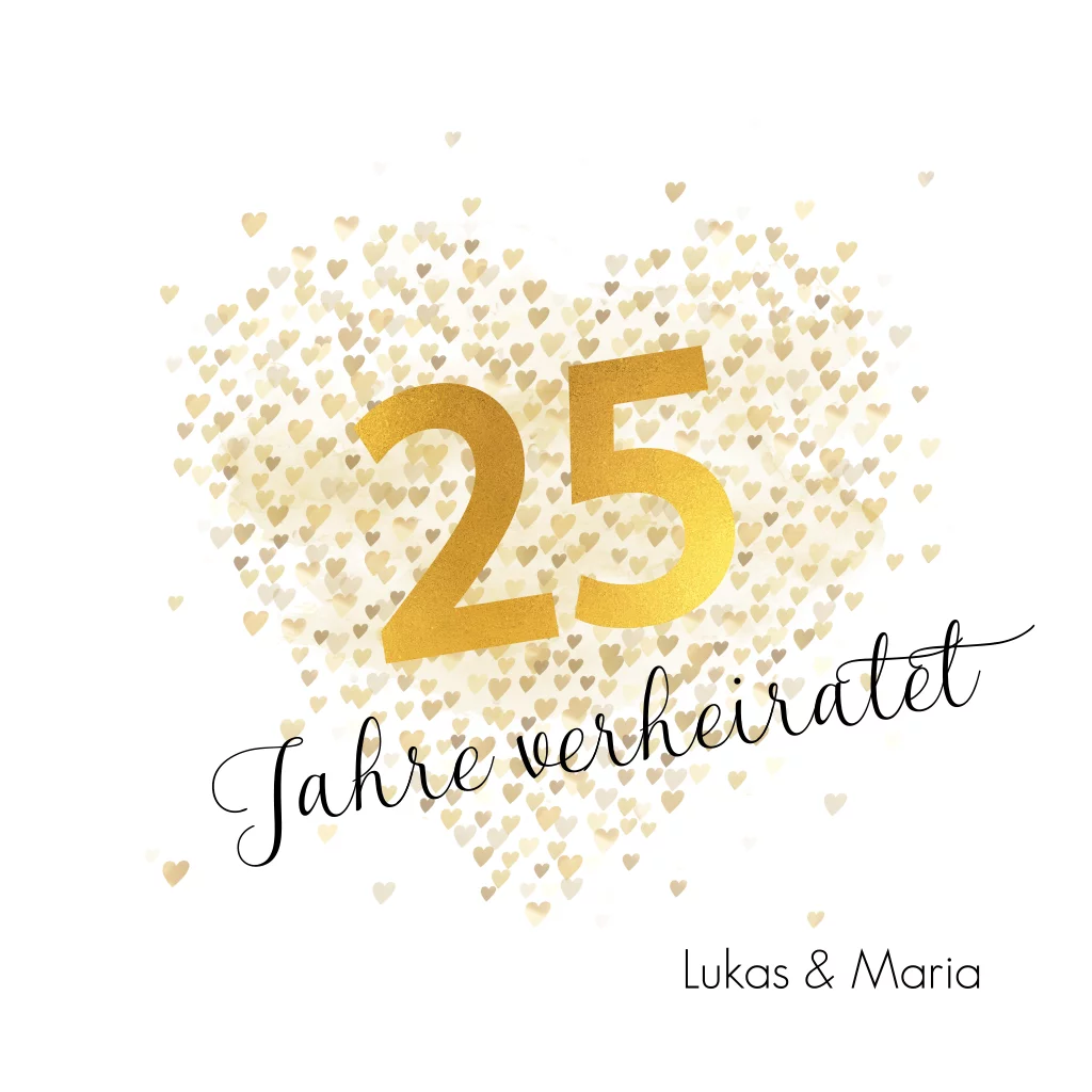 Die große, goldgelbe 25 wird auf dieser Silberhochzeitskarte stimmungsvoll von vielen kleinen Herzen umgeben, die gemeinsam ein großes Herz bilden. Sie können ein persönliches Foto sowie eigene Einladungsworte auf der Karteninnenseite platzieren.