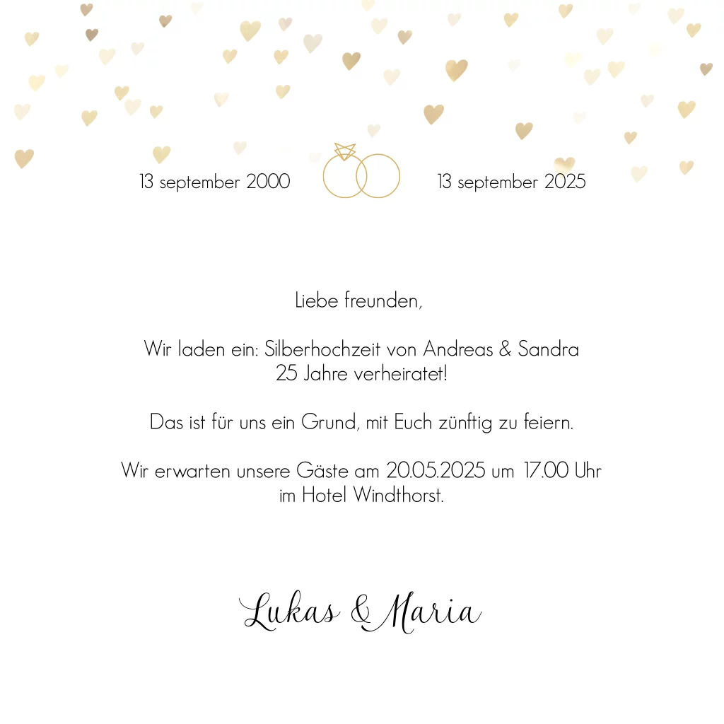 Schöne Silberhochzeitseinladung mit goldgelben Herzen und Foto