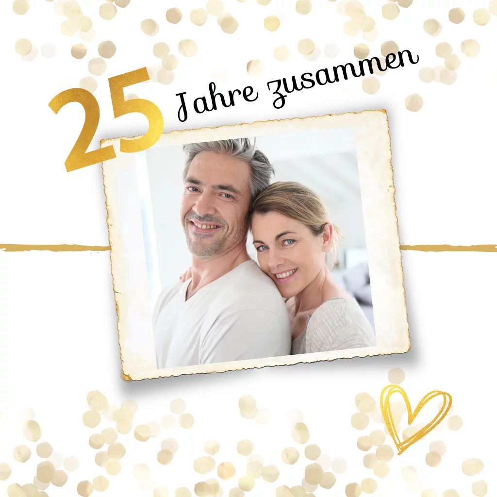 Schicke Silberhochzeitseinladung mit Herzen, Konfetti und Foto