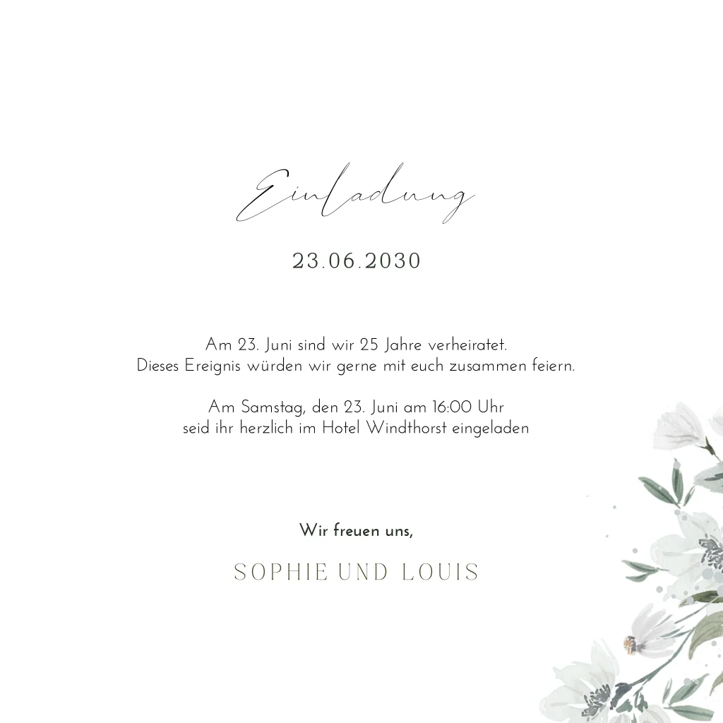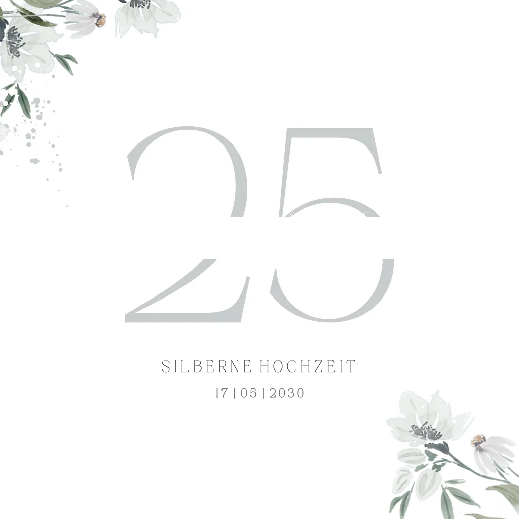 Stilvolle Einladung zur silbernen Hochzeit mit Blumen und Silberfolie
