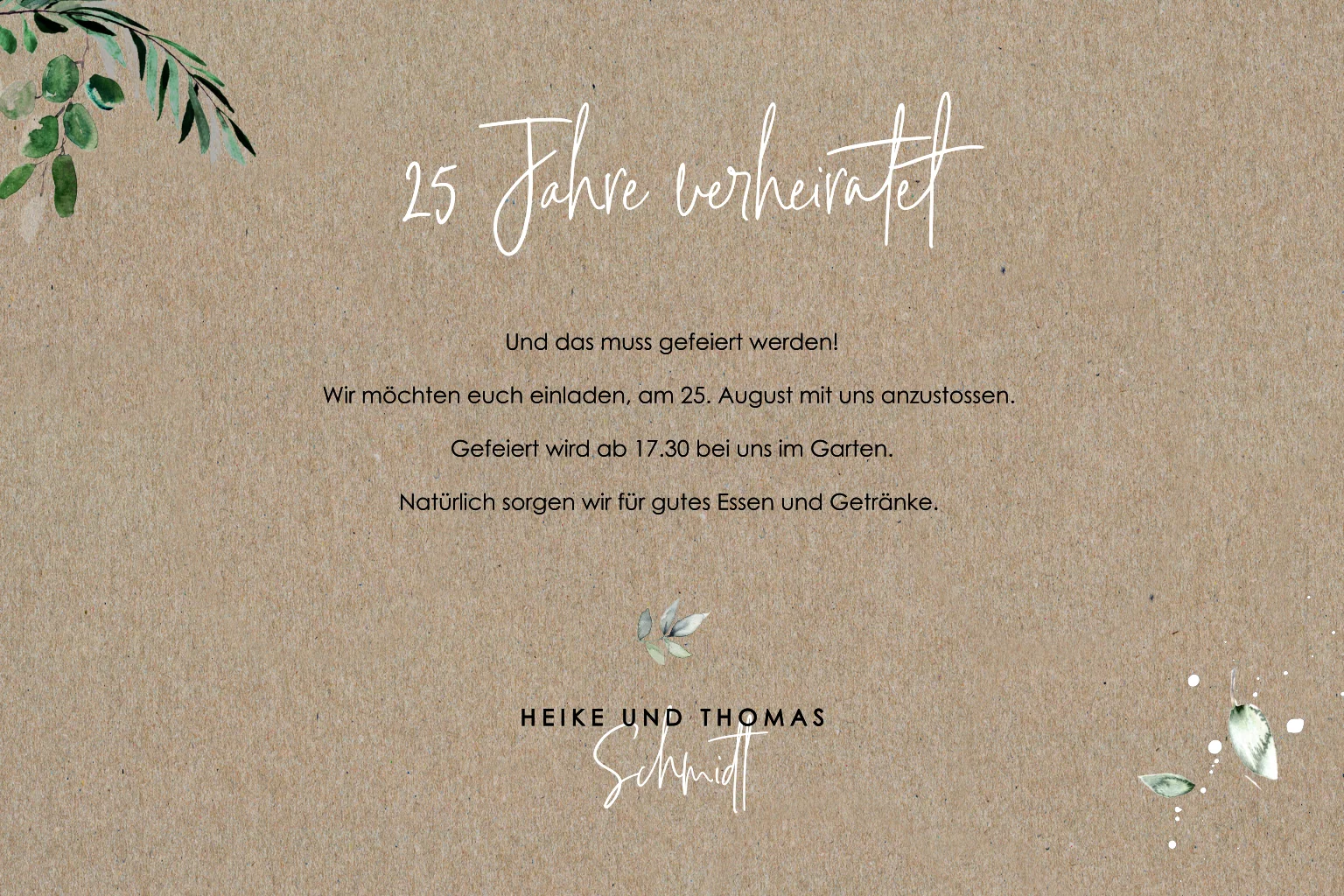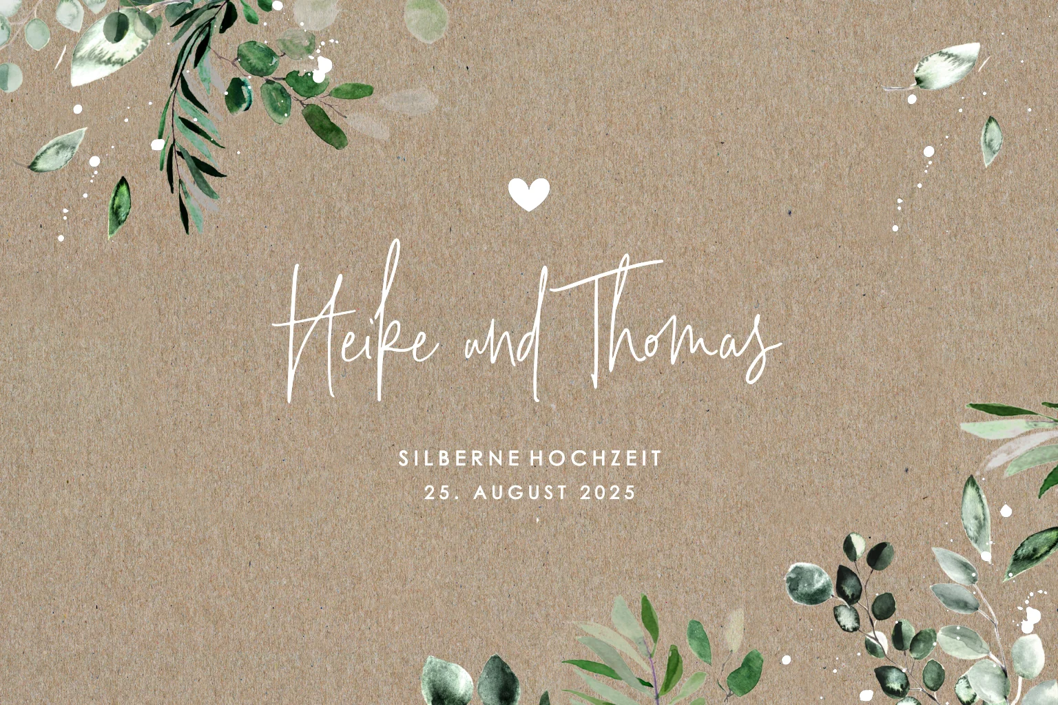 Stilvolle Einladungskarte zur silbernen Hochzeit mit Eukalyptuszweigen auf Kraftpapier