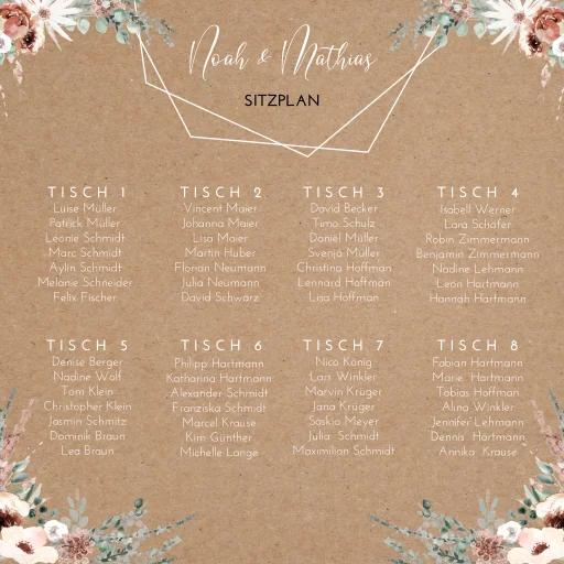 und Sitzplan zur Hochzeit sorgt für die perfecte Tischordnung und jeder Geladene weiß direct wohin zum Dinner. Den Tischplan mit Blumen und Geometrie im Kraft-Look kannst du nach Wunsch auch selbst gestalten.Alle wichtigen Informationen zu unseren Schildern findest du hier.