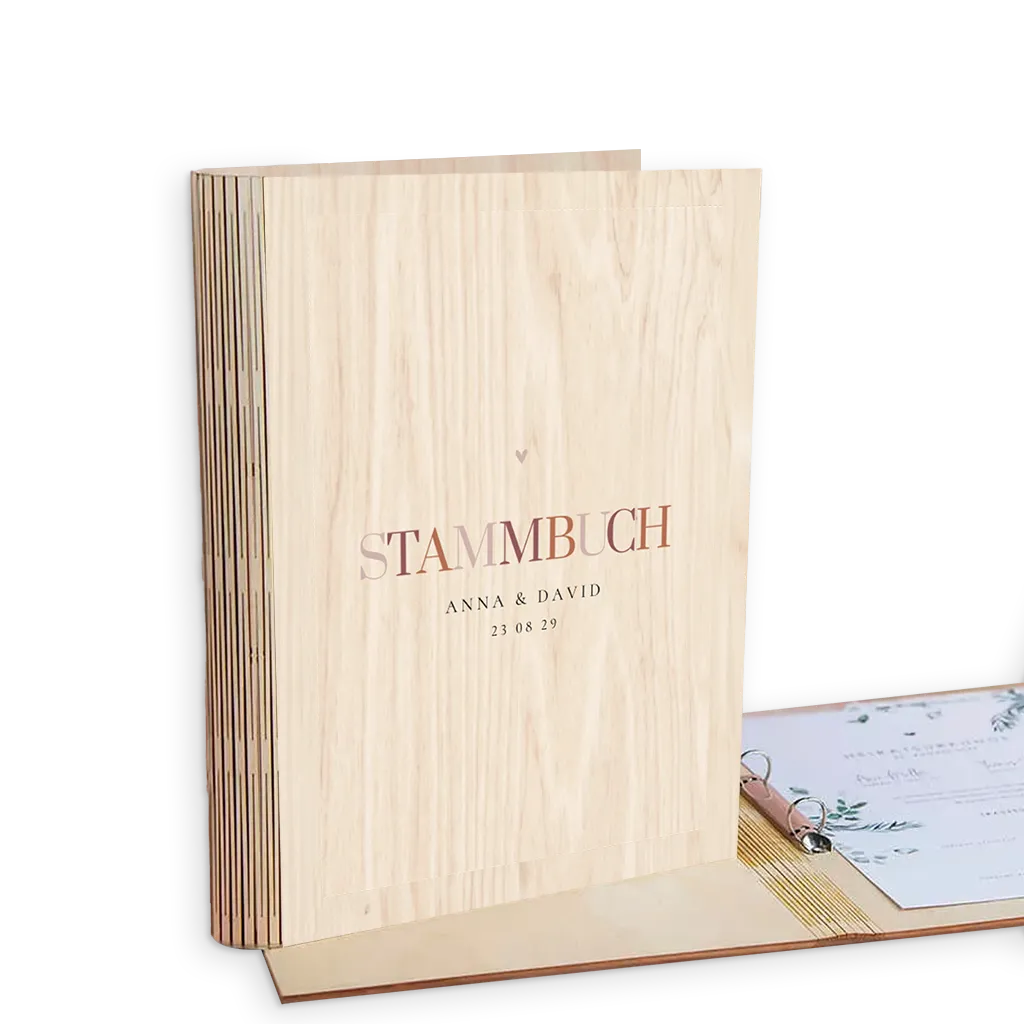• Der Stammbuch-Ringordner wird leer geliefert, also nur der Umschlag aus Holz mit zwei silberfarbenen Ringen innen