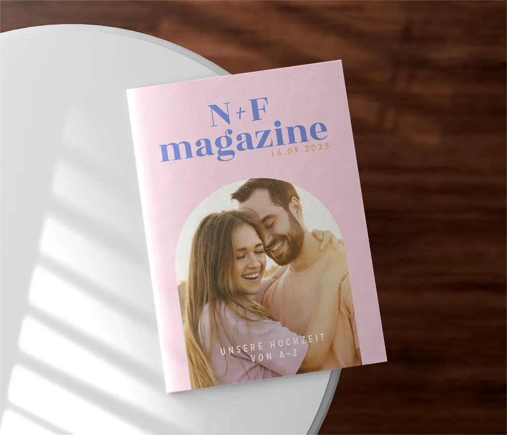 Das Heft wird durch zwei Heftklammern stabil zusammengehalten und kann sowohl auf Papier mit matter Oberfläche (Holzfreies Papier 170g/m²) als auch auf Papier mit glattem, leicht glänzendem Papier (Seidenglanz 170g/m²) gedruckt werden. Du kannst dabei zwischen einem 8- als auch einem 12-seitigen Heft aus unserem Sortiment wählen. Diese Version hier hat 8 Seiten; wenn du lieber 12 Seiten möchtest, kontaktiere uns bitte dahingehend.
