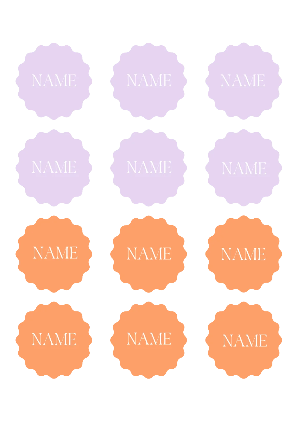 Fröhliche Namenskarten mit gewelltem Rand in Violett und Orange und optionaler Menükarte