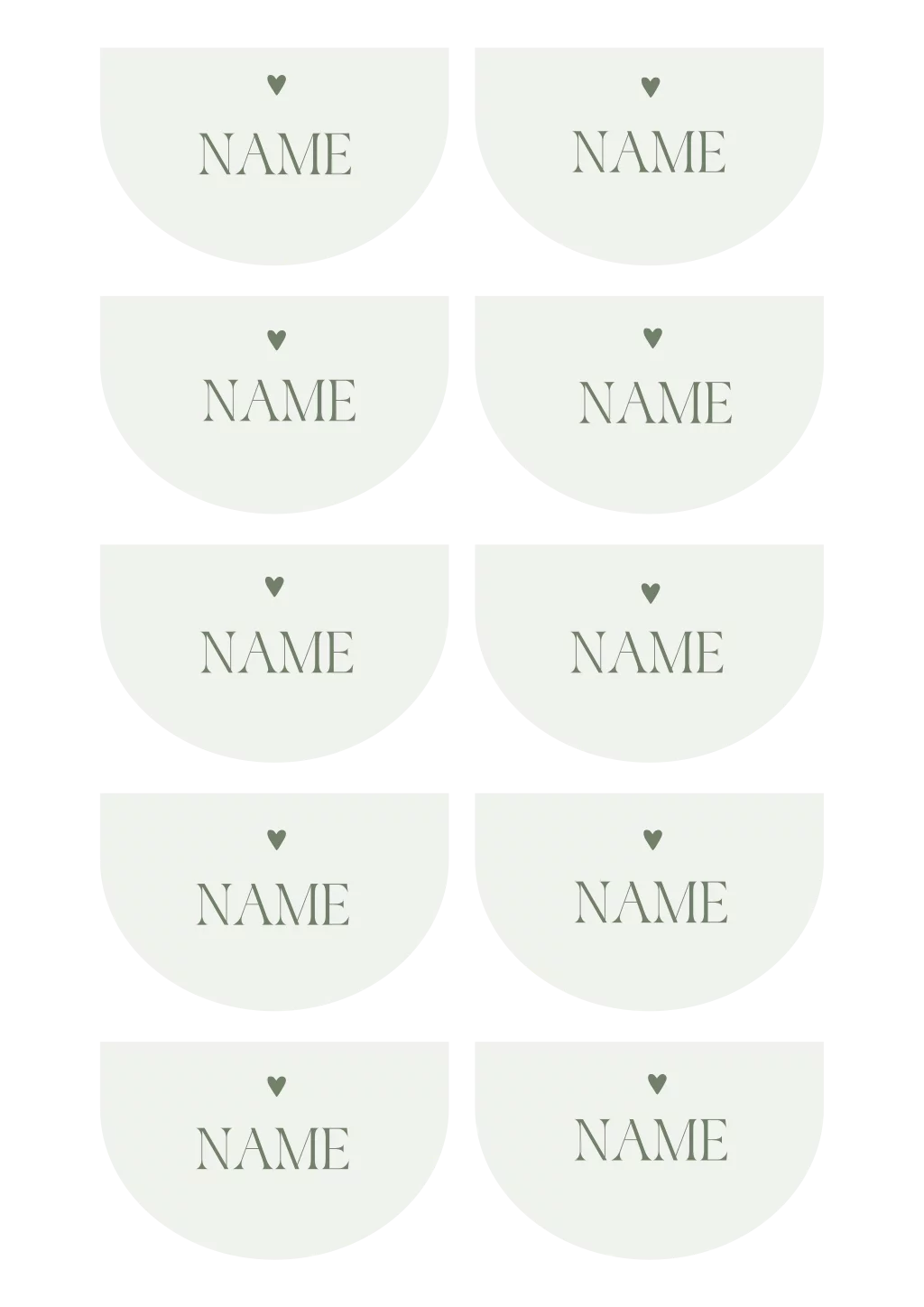 Grüne Namenskarten in Bogenform und Herz mit optionaler Menükarte