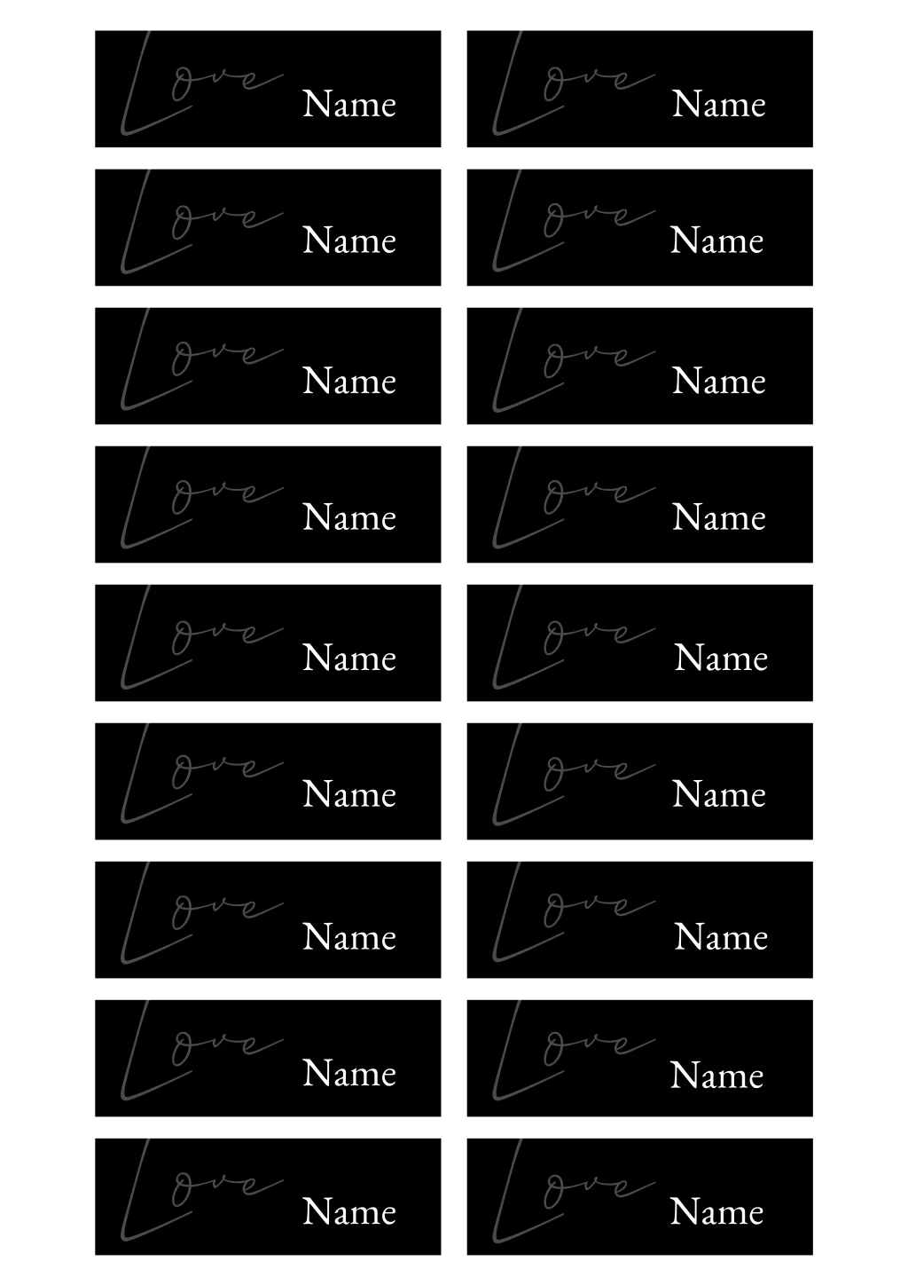 Namenskarten 8x2,5cm auf schwarzem Hintergrund und moderner Schrift Dazu empfehlen wir passende, stilvolle Namenskartenhalter aus Holz oder Metall, erhältlich in verschiedenen Formen.Wir haben auch viele andere Produkte mit diesem Design im Sortiment. Sollte es für dein Traumformat noch fehlen, setzen wir es gerne für dich um! Kontaktiere dazu einfach unseren Kundenservice.