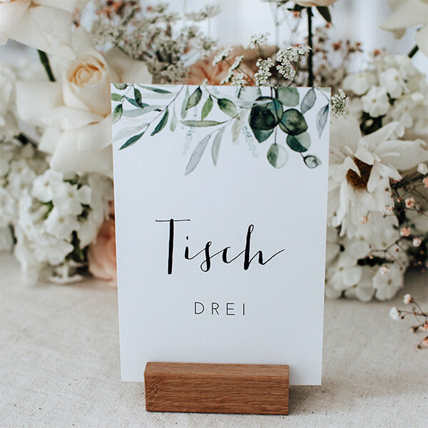 und Das Hochzeitskarten-Set beinhaltet viele weitere Karten mit diesem Design. Ein perfektes Rundum-sorglos-Paket für Ihre einzigartige Hochzeit!Dazu empfehlen wir stylische Kartenhalter aus echtem Holz, um die Karte in voller Pracht zu präsentieren. Hier gelangst du direkt zur Auswahl.