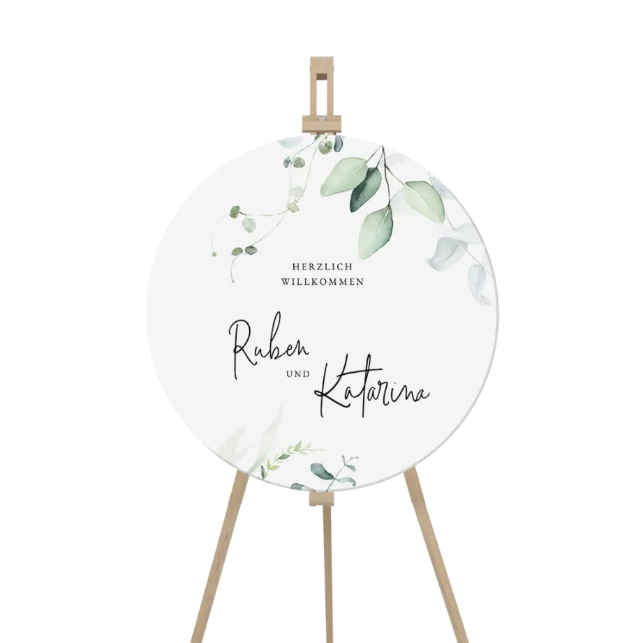 Rundes botanisches Hochzeitsschild, personalisiert mit euren Namen im selben Farbton wie der Eukalyptus, der sich am Rande des Schildes befindet.Alle wichtigen Informationen zu unseren Schildern findest du hier.