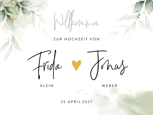 Auf eurer Hochzeit möchtet ihr eure Gäste natürlich auf angemessene Weise begrüßen. Platziert dieses schöne Schild im Stil eurer Hochzeitspapeterie am Eingang eurer Location und eure Gäste wissen sofort, dass sie am richtigen Ort sind. Dieses Schild hat eine Größe von 80x60 cm. Hast du schon die dazu passende Save the Date Karte, Hochzeitskarte, Menükarte und Dankeskarte gesehen?💰 Budgettipp: Dieses Design ist auch als großes Poster erhältlich. Auf Anfrage können wir jedes Design auf das gewünschte Produkt übertragen.