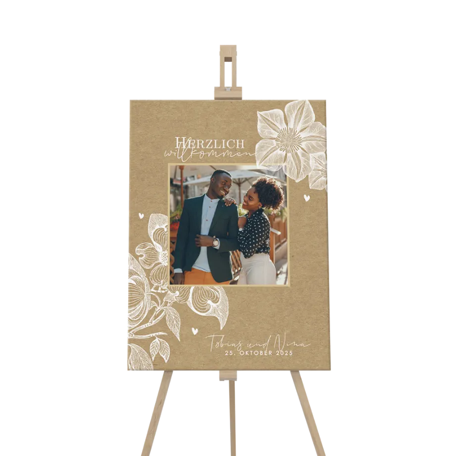 Begrüsst eure Gäste mit einem tollen Willkommensschild mit anmutigen weißen Blumen und eurem Foto. Es besticht durch natürlichen Designkarton im rustic Kraftpapier-Look und ist mit modernen Schriftzügen bestückt absolut im Trend.💰 Budgettipp: Dieses Design ist auch als großes Poster erhältlich. Auf Anfrage können wir jedes Design auf das gewünschte Produkt übertragen.