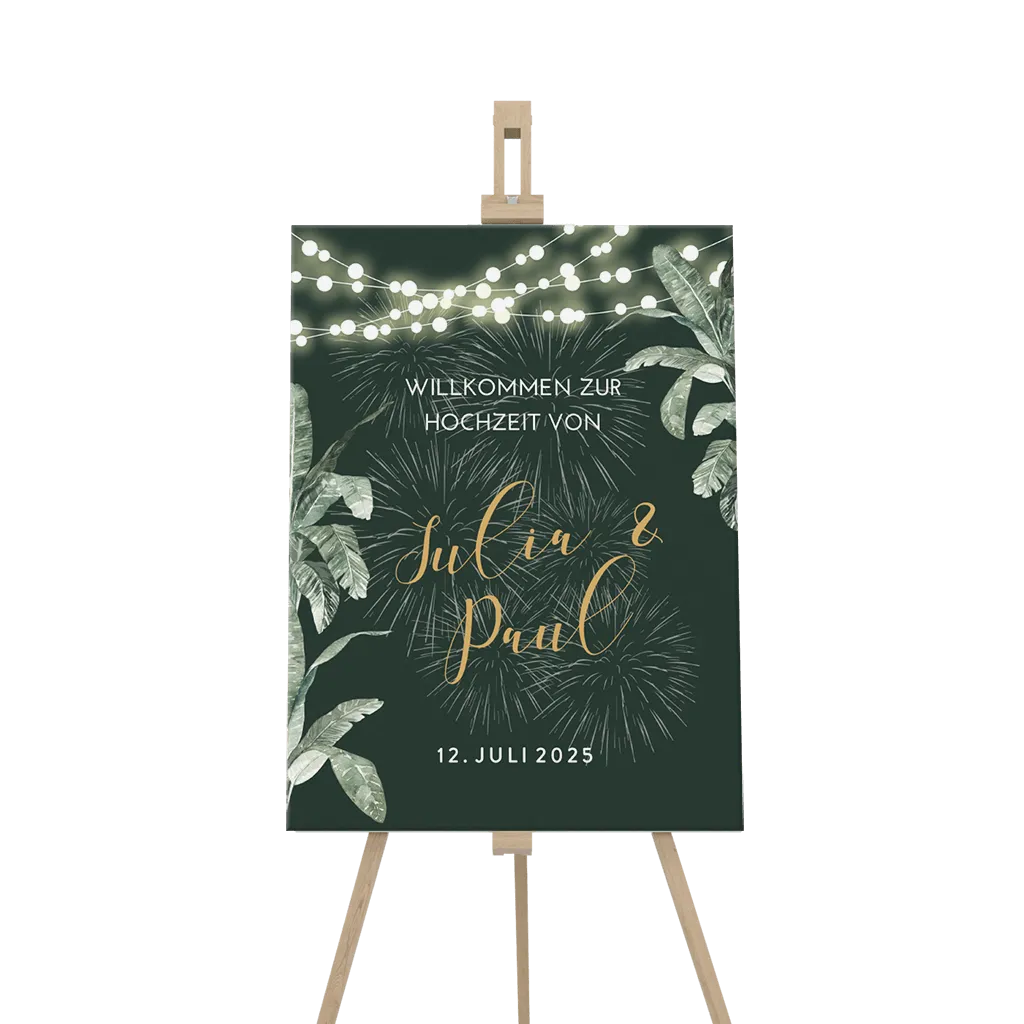 Willkommensschild für Hochzeit mit tropischen Palmen und Lichterketten auf dunklem Hintergrund| 57 × 75 cm | ab 59,95 € Stckpr. |