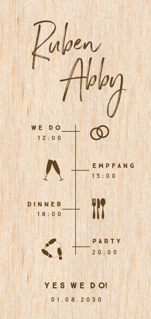 Schmale Hochzeitseinladung in Echtholz mit illustriertem Tagesablauf. Dieses Design ist perfekt für Paare, die nach einer natürlichen und ausgefallenen Einladung suchen.