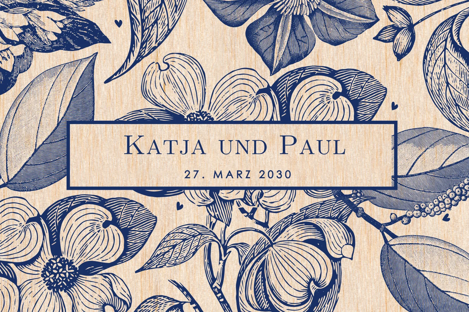 Hochzeitseinladung aus Holz mit Delfter-Blau-Blumen. Dieses Design ist perfekt für Paare, die nach einer klassischen und floralen Einladung suchen.