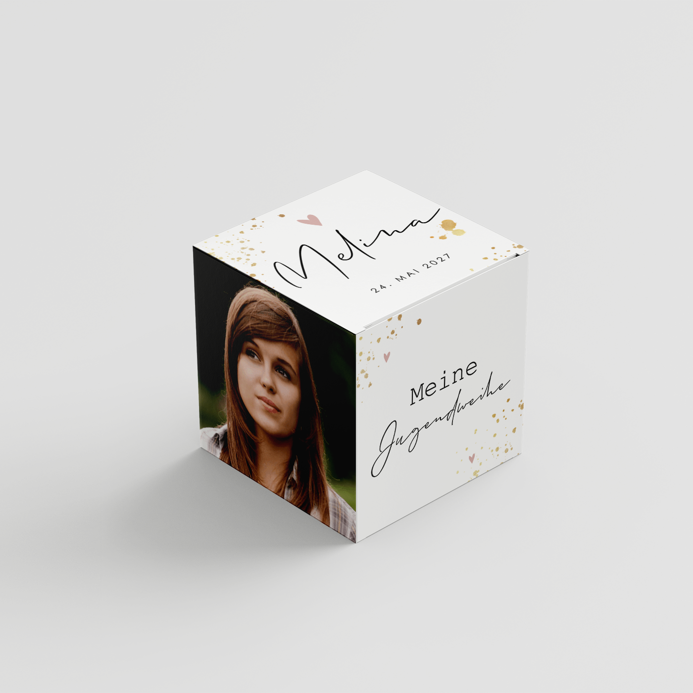 Die Box ist 5 cm hoch, breit und tief und wird ungefaltet geliefert.