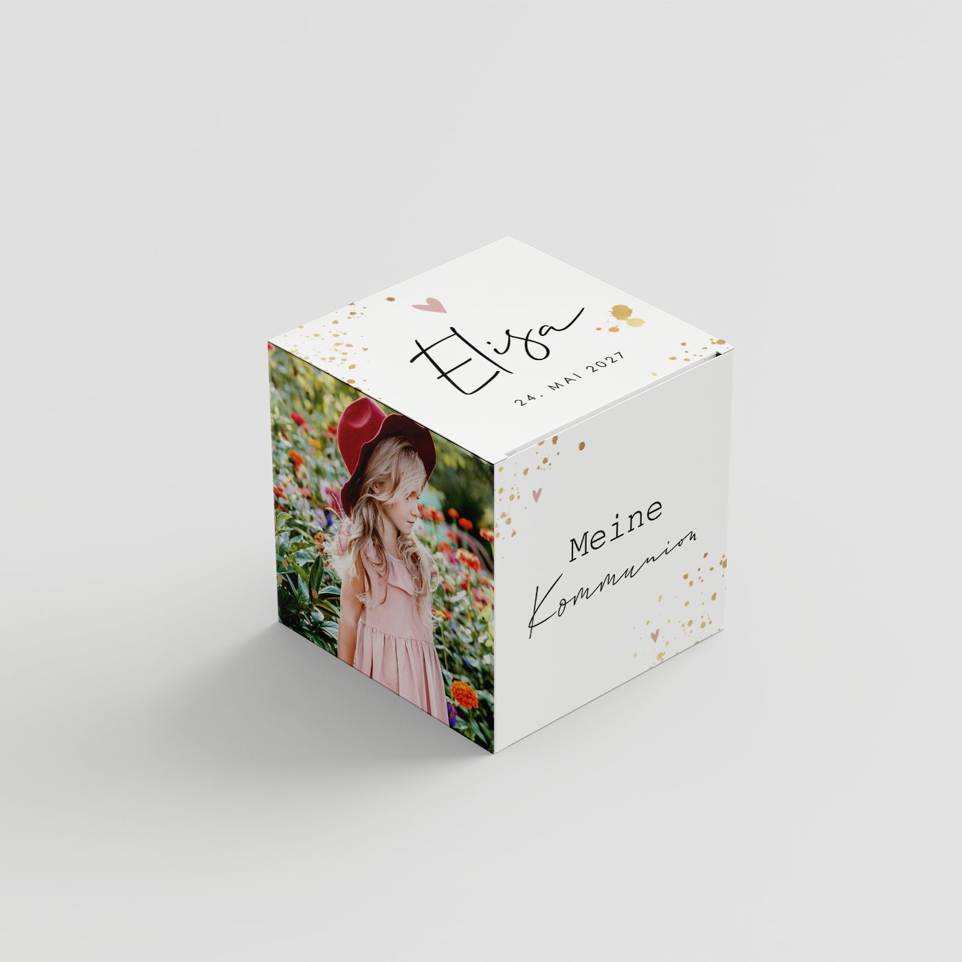 Die Box ist 5 cm hoch, breit und tief und wird ungefaltet geliefert.