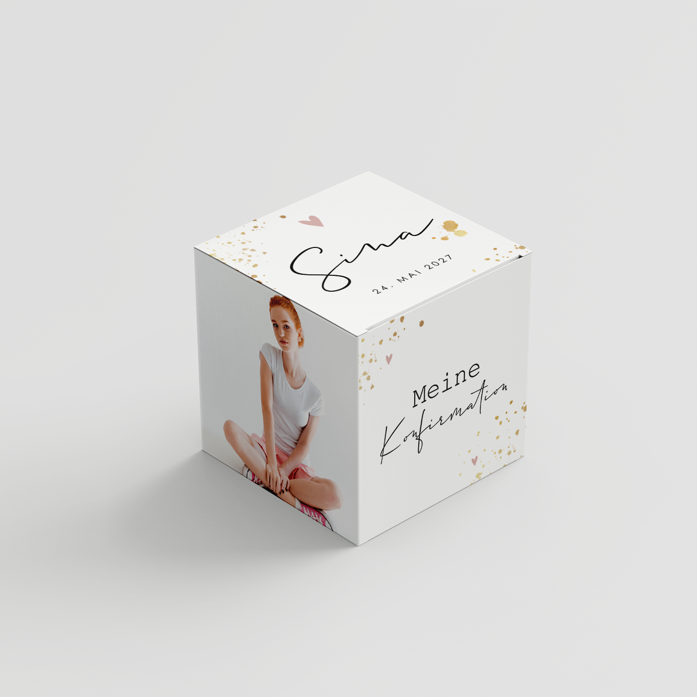 Die Box ist 5 cm hoch, breit und tief und wird ungefaltet geliefert.