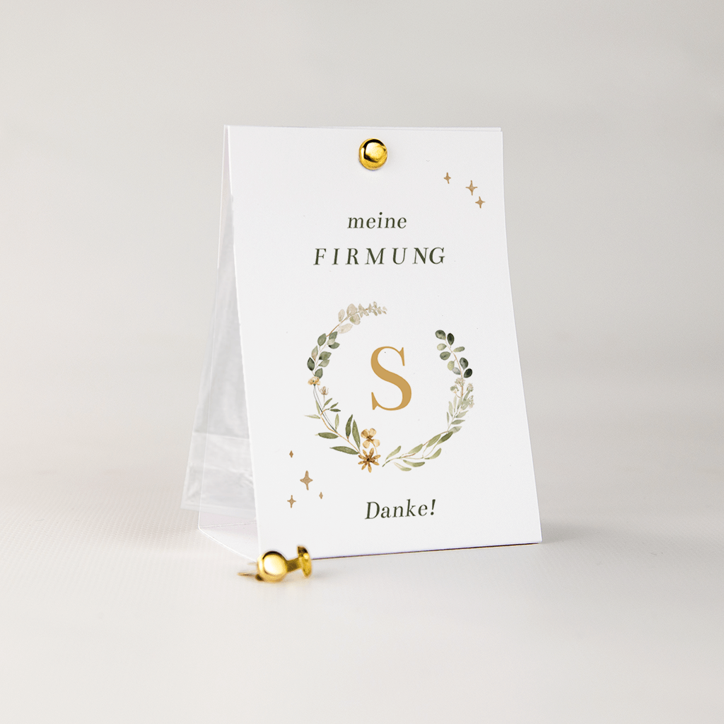 Gastgeschenkverpackung Firmung in Grüntönen mit floralen Akzenten.