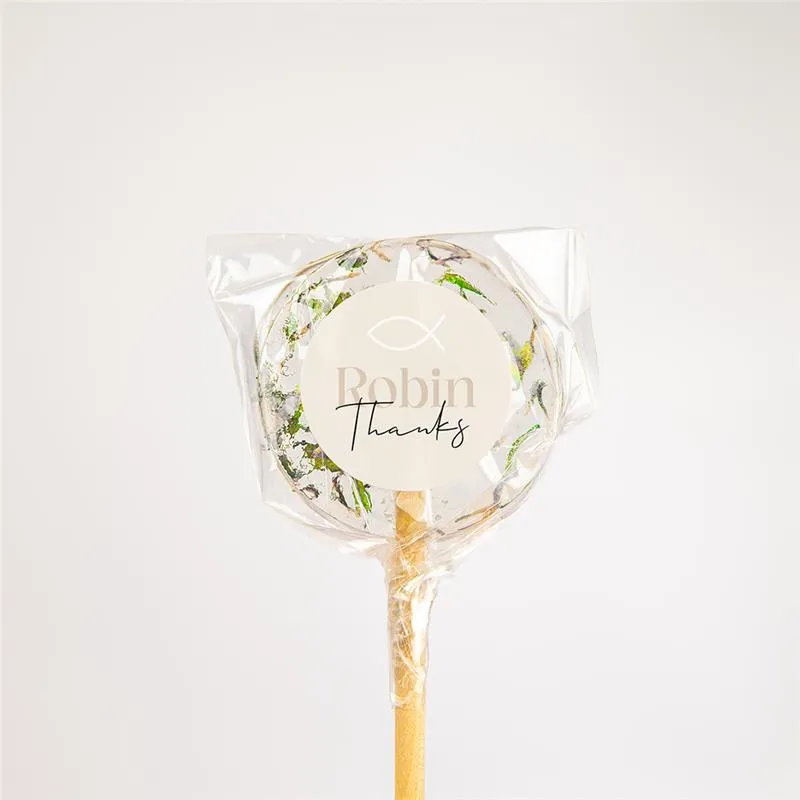 Runder Aufkleber zur Kommunion in Beige mit weißem Fisch