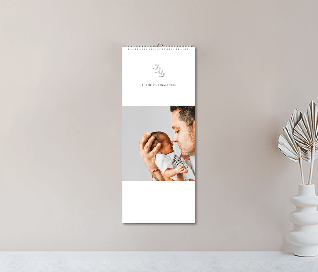 Länglicher Geburtstagskalender mit Fotos und Zweige. Unsere Kalender sind in verschiedenen Formaten erhältlich. Wenn du ein anderes Format wünschst, kontaktiere einfach unseren Kundenservice.