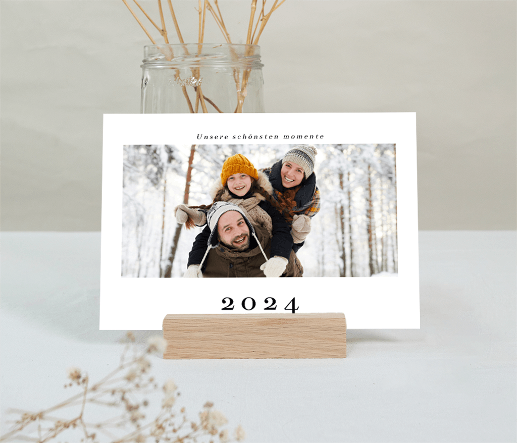 Tischkalender sind auf hochwertigem Papier gedruckt und werden durch einen hölzernen Kartenhalter auf stilvolle und dekorative Weise präsentiert.