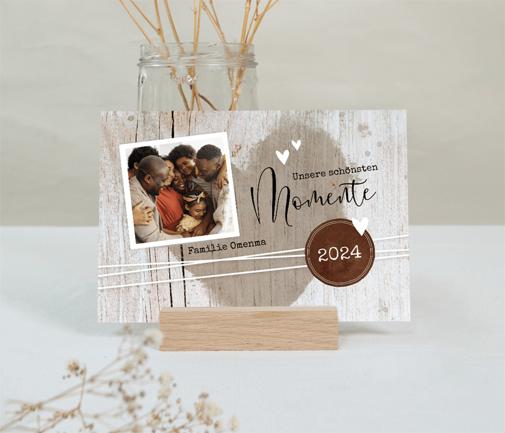 Tischkalender sind auf hochwertigem Papier gedruckt und werden durch einen hölzernen Kartenhalter auf stilvolle und dekorative Weise präsentiert.