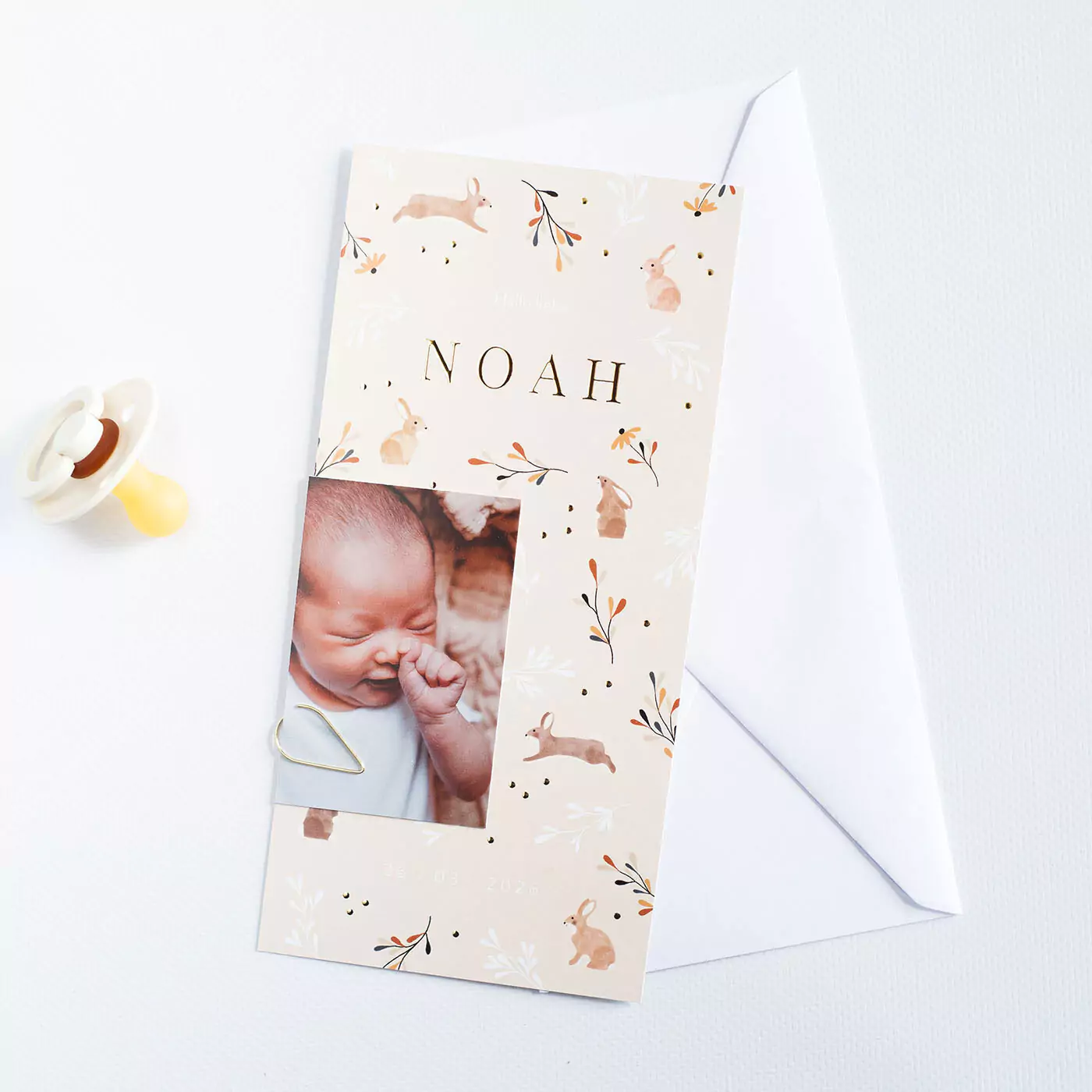 Die Geburtskarte ist im länglichen Hochformat gestaltet und auf der Vorderseite mit niedlichen Kaninchen, Zweigen, Blumen und goldenen Folienakzenten verziert. Auf der Rückseite sind erneut Kaninchen und Zweige zu sehen, zusammen mit den Geburtsinformationen und der Adresse der Familie des Neugeborenen. Die Karte ist so konzipiert, dass man ein Babyfoto mit einer hübschen Klammer befestigen kann, um sie zu personalisieren.Melde dich für unseren Newsletter an und profitiere von exklusiven Angeboten, kreativen Ideen und Neuigkeiten aus unserer Produktwelt. Als Dankeschön für deine Anmeldung schenken wir dir einen kostenlosen Probedruck deiner Karte.