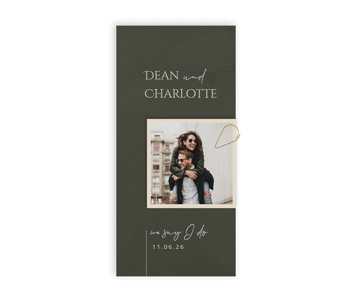 Hochzeitseinladung in Grün mit Foto als zweiteiliges Kartenset. Dieses Design ist perfekt für Paare, die nach einer stilvollen und eleganten Einladung suchen.