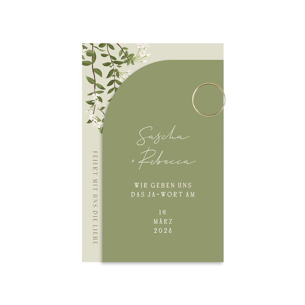Botanische Hochzeitseinladung mit gebogener Karte und Blütenzweigen.