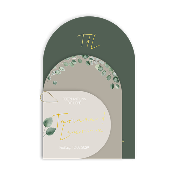Hochzeitskarten-Set in gebogener Form und mit Blättern. Dieses Design ist perfekt für Paare, die nach einer verspielten und natürlichen Einladung suchen.