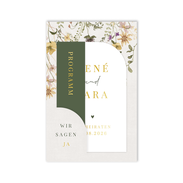 Florales Kartenset - Einladung zur Hochzeit in Grün und Beige mit Folienschrift. Dieses Design ist perfekt für Paare, die nach einer romantischen und stilvollen Einladung suchen.