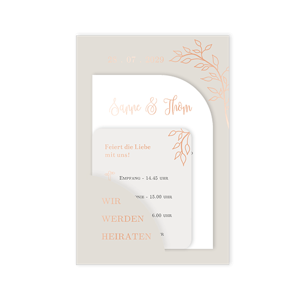 Hochzeitseinladung in gebogener Form mit Roségoldfolie. Dieses Design ist perfekt für Paare, die nach einer stilvollen und schlichten Einladung suchen.