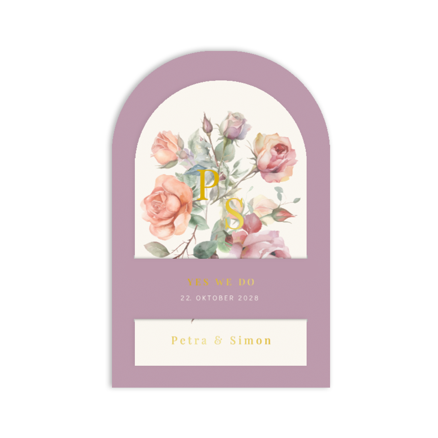 Florales Kartenset in Bogenform als Einladung zur Hochzeit mit Pastellfarbenen Rosen.