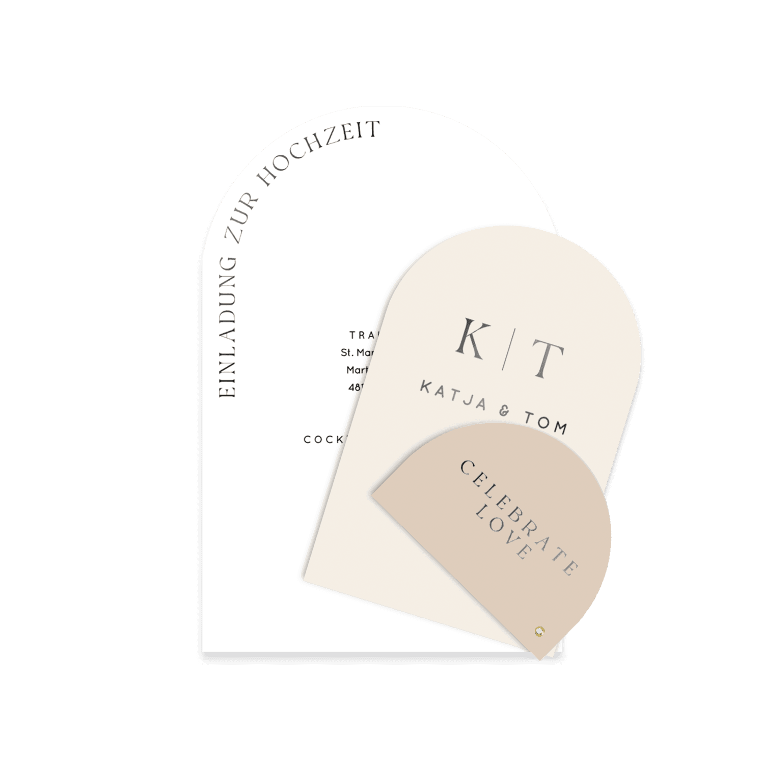 Kartenset beige/schwarze Schrift in gebogener Form. Dieses moderne Design ist perfekt für Paare, die nach einer moderne und einzigartigen Einladung suchen.