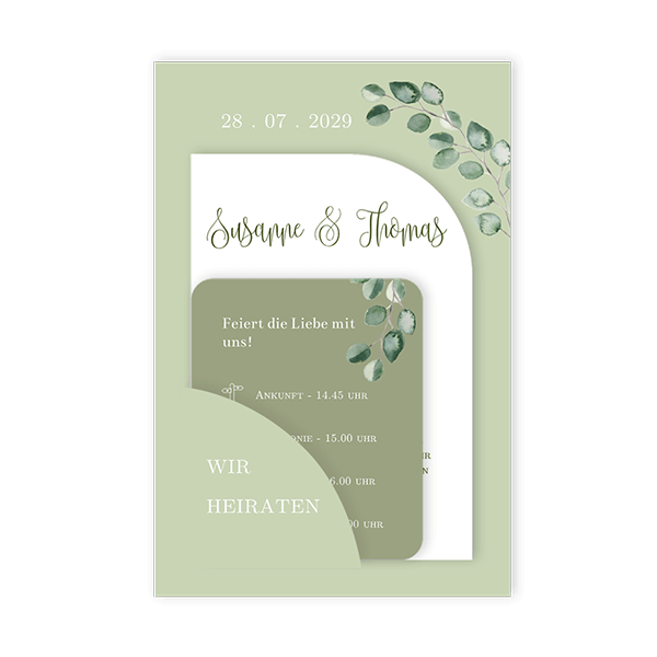 Hochzeitskarten-Set in verschiedenen Grüntönen und Eukalyptuszweigen. Dieses Design ist perfekt für Paare, die nach einer schlichten und natürlichen Einladung suchen.